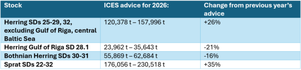 The advice provides key figures for several important fish stocks in the Baltic Sea. Below is an overview of the ICES advice for 2026, alongside previous years’ advice and Total Allowable Catches (TACs) for comparison. All advice is in accordance with the EU multiannual plan (MAP) for the Baltic Sea.